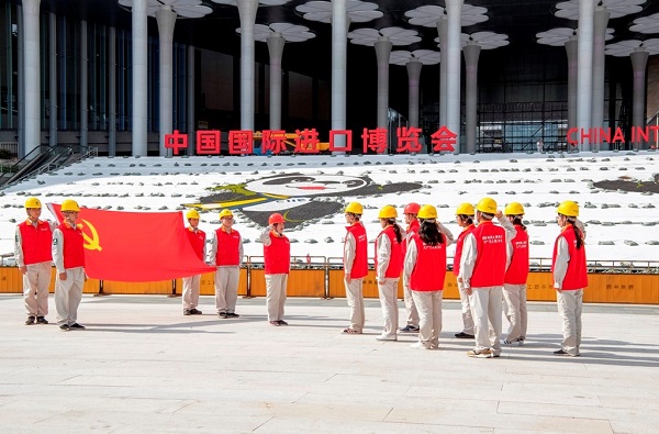 國網上海青浦供電“愛融黨員服務隊”在進博會場館外宣誓,將全力以赴做好盛會保障工作