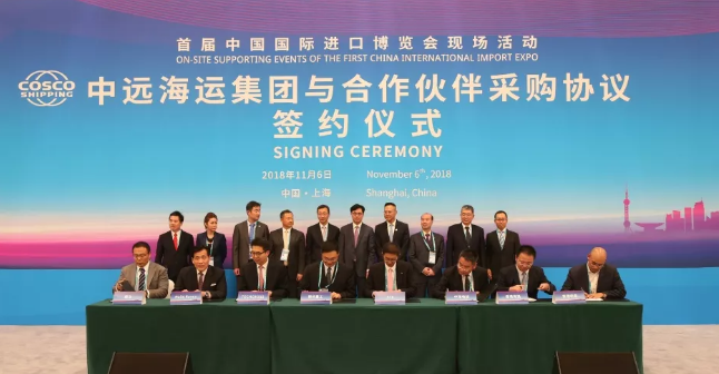 11月(yue)6日,在(zai)首(shou)屆(jie)中(zhong)國(guo)國(guo)際進口博(bo)覽會上,中(zhong)國(guo)遠洋海運集團(以下簡稱中(zhong)遠海運)所屬(shu)企業與全球合作伙伴簽(qian)訂了27筆采(cai)購協(xie)議。