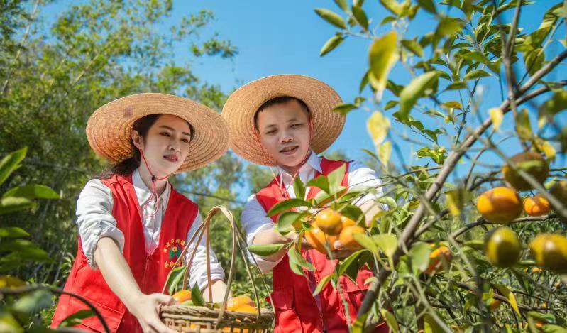 廣西農信社金融服務先鋒在浦北縣龍門鎮日新村幫助農戶采摘柑果