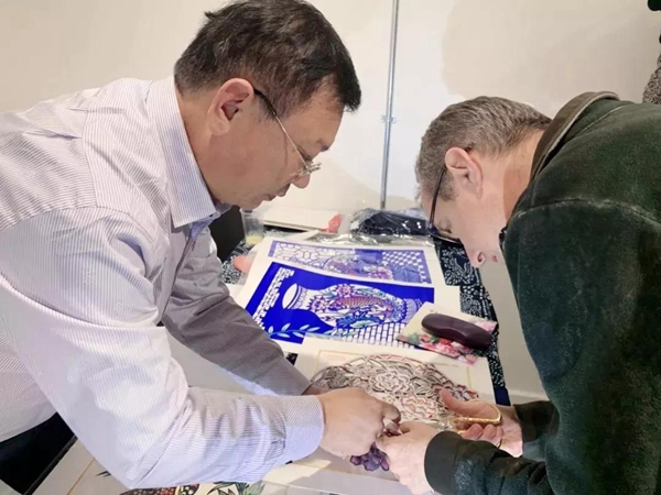 真絲剪紙傳承人金國榮老師與國外友人現場互動