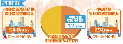 2018年(nian),國企堅持穩中求進(jin),頂住(zhu)經(jing)濟下(xia)行壓力,實(shi)現整體(ti)效(xiao)益大幅增(zeng)(zeng)(zeng)長(chang)。數據顯示,2018年(nian),國資監管系統企業累計實(shi)現營業收(shou)入54.8萬億元,同比增(zeng)(zeng)(zeng)長(chang)10.3%;實(shi)現利潤(run)(run)總額3.4萬億元,同比增(zeng)(zeng)(zeng)長(chang)13.2%;實(shi)現凈利潤(run)(run)2.4萬億元,同比增(zeng)(zeng)(zeng)長(chang)12.1%。