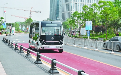 5月17日,自動駕駛巴士在鄭州市中道東路上行駛。在5G網絡傳輸條件下,自動駕駛巴士能夠快速、精準地識別紅綠燈、行人、障礙物,執行避障、超車、進站以及緊急制動等功能。新華社記者 李嘉南攝