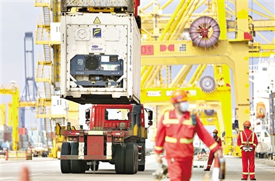 一輛貨車在大連港大連集裝箱碼頭有限公司港口裝載集裝箱。今年以來,遼港集團大連港以“完善航線布局,提高吞吐量”為抓手,大力推進集裝箱內外貿航線及多品種貨源的開發,多措并舉拓展市場。