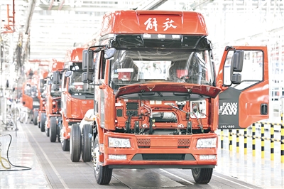 在位于長春的一汽解放總裝車間,車輛在生產線上等待裝配。中國一汽前三季度銷售整車超265萬輛,同比增長8%。