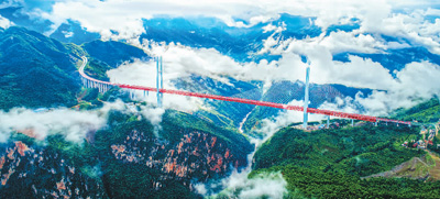 ——云貴兩省交界處,北盤江特(te)大(da)橋高空聳立(li),橋面到谷底垂直高度565米,成為(wei)目前世界第一高橋;