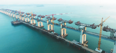 施工(gong)海域最(zui)(zui)大水深42米(mi),最(zui)(zui)大潮差7.0米(mi),最(zui)(zui)大浪(lang)高2.71米(mi),一個浪(lang)涌上(shang)來,甚(shen)至會將鋼(gang)纜扯(che)斷。怎么建(jian)?中鐵大橋(qiao)局集團(tuan)和(he)中國(guo)鐵建(jian)大橋(qiao)局的建(jian)設(she)者們“吃技(ji)術飯(fan),打設(she)備仗(zhang)”,自主研發了埋(mai)植式鋼(gang)混組合海上(shang)平(ping)臺(tai)、雙孔連做(zuo)造橋(qiao)機(ji)、大直徑(4.5米(mi))鉆(zhan)孔樁、斜(xie)拉橋(qiao)邊跨的整孔吊裝技(ji)術,在(zai)海床裸巖上(shang)安(an)裝大型海上(shang)施工(gong)平(ping)臺(tai),這(zhe)些(xie)技(ji)術都屬于國(guo)內首創,國(guo)際領先。