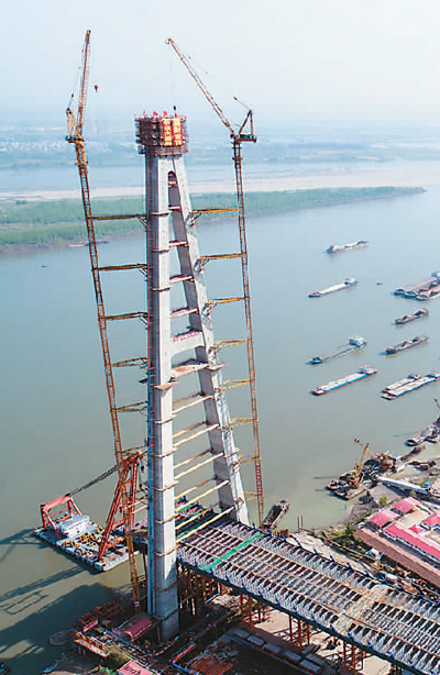 圖為4月10日,該橋南岸主塔成功封頂。(新華社記者 肖藝九攝)