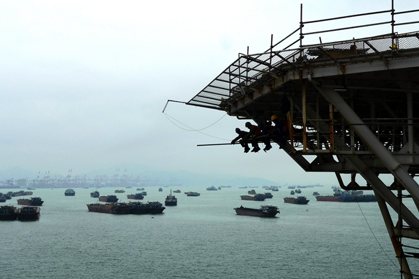 作業人員在直升機甲板下方搭建腳手架。