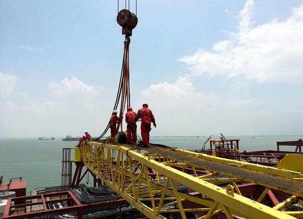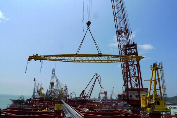 “南海勝利”號FPSO后吊車吊臂正在通過吊裝準備送運到塢修碼頭進行維護保養。