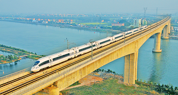 廣深港高鐵(tie)廣深段通(tong)車運(yun)營,動(dong)車組駛過沙(sha)灣水(shui)道特大橋