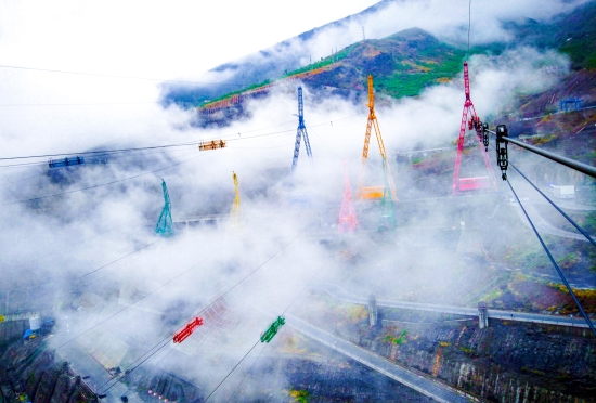 “你(ni)看(kan)到云霧中(zhong)這(zhe)些彩色(se)的機械了(le)嗎?這(zhe)是我(wo)們白鶴灘水電站的纜(lan)機群,是我(wo)們的‘七(qi)仙(xian)女。”