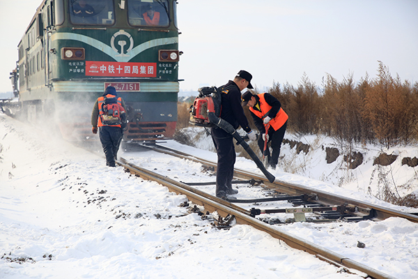“劉隊(dui)長(chang),道岔被大雪覆蓋,行車安全(quan)隱(yin)患增加,需要立即(ji)清理,我們人手不夠。”