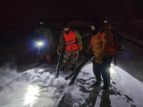 用(yong)鐵(tie)鍬鏟,用(yong)掃(sao)帚掃(sao),再(zai)用(yong)吹風(feng)機吹……下午4點(dian)(dian),天(tian)就黑了下來(lai),隊員(yuan)們(men)分工(gong)協作,在手電筒(tong)微弱的光束下,頂(ding)著風(feng)雪(xue)艱難前行(xing)。兩(liang)個小時下來(lai),5組道(dao)岔上的鋼軌清晰顯露出來(lai)。隊員(yuan)們(men)來(lai)不及(ji)停歇,又趕往下一(yi)個站點(dian)(dian)。