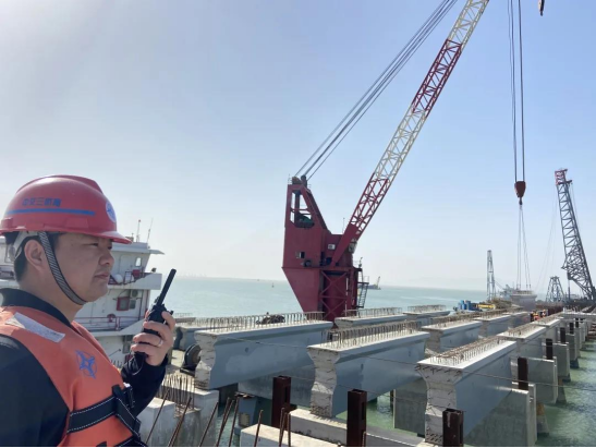 按照設計方案,每榀構件為長22米,重達百噸的大型長方體,項目部需要將共計712榀構件如同搭積木般吊裝在樁帽上。復工首日,第六區首榀構件安裝在即,但隨著工程的推進,起重船靠泊位置距離吊裝作業中心點越來越遠,為安全起見,現有起重船在吊重和吊距上都已無法完成后續長距離安裝。“‘老伙計’陪我們東征西戰這么久,一定有辦法。”王國正心想。