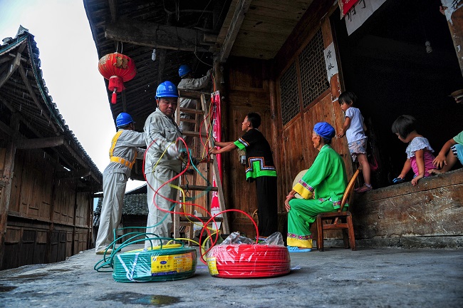 酉陽供電公司員工為酉水河村土家山寨村民安裝電源