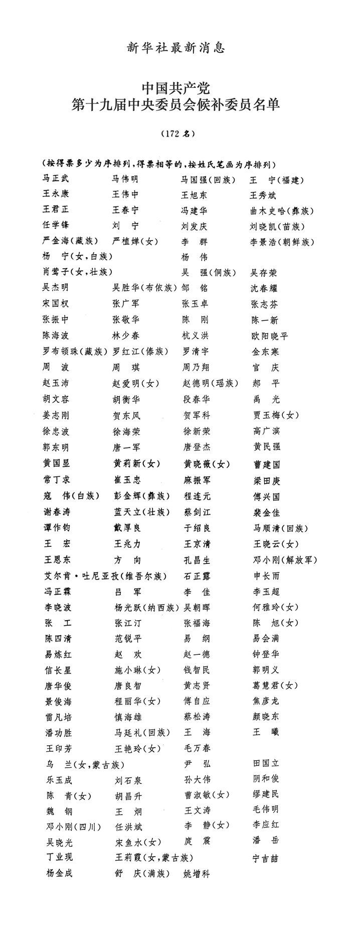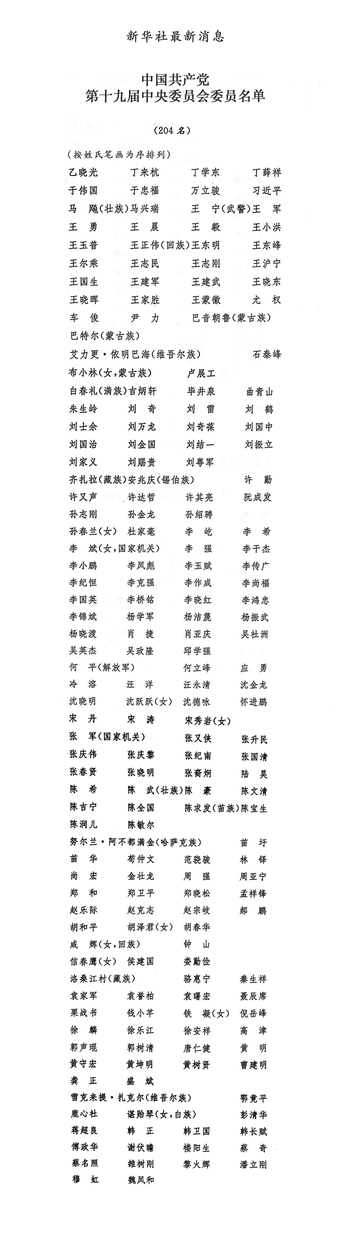 十九屆中央委員、候補中央委員、中央紀委委員名單發布