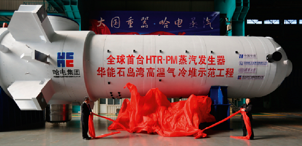 10月31日上(shang)午,由哈電集團(秦皇島)重(zhong)型裝備有限公(gong)司(以下(xia)簡稱(cheng)哈電重(zhong)裝)制造的(de)全(quan)球首臺(tai)(tai)球床模塊式高溫氣冷堆(dui)蒸汽發(fa)生(sheng)器(qi)(qi)順利通過驗(yan)收(shou)。隨后(hou),在哈電重(zhong)裝核島廠房,哈電集團黨委書記(ji)、董事長斯澤夫與中(zhong)國華能(neng)集團黨組成員(yuan)、副總經理葉向東聯手為這臺(tai)(tai)“國之重(zhong)器(qi)(qi)”揭幕,覆蓋在蒸汽發(fa)生(sheng)器(qi)(qi)上(shang)的(de)紅綢緞(duan)落下(xia)的(de)瞬間,現場響(xiang)起了熱(re)烈的(de)掌聲(sheng)。