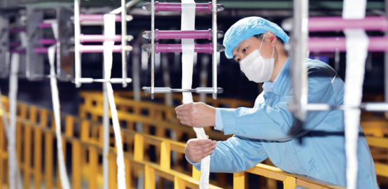 為抗擊疫情,中石化組織社會力量開展了一場口罩增產大會戰。圖為中石化儀征化纖生產現場。