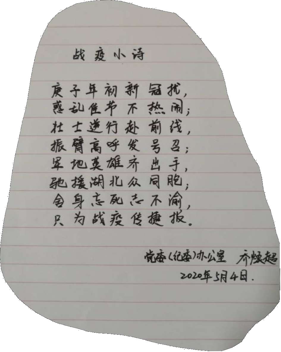 筆談交流中,每位青年(nian)同志都寫了自己的戰疫體會,用一段段樸實(shi)的話語、飽含深情(qing)的詩詞向(xiang)奮戰在(zai)戰疫一線(xian)的英雄(xiong)們致敬,為自己做好防疫復工(gong)、完成本職工(gong)作、助力脫貧攻堅加油打氣。