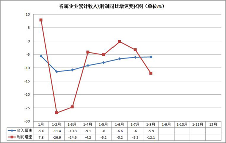 1-8月份(fen)(fen),安徽省屬企(qi)業(ye)(ye)(ye)累計實(shi)現(xian)營業(ye)(ye)(ye)收入4001.2億(yi)元,同比(bi)(bi)(bi)下(xia)降5.9%,實(shi)現(xian)利潤總(zong)(zong)額(e)153億(yi)元,同比(bi)(bi)(bi)下(xia)降12.1%;實(shi)現(xian)勞動生產(chan)總(zong)(zong)值746.8億(yi)元,同比(bi)(bi)(bi)下(xia)降3.9%,降幅較1-7月份(fen)(fen)擴大0.5個百分(fen)點。其中,8月份(fen)(fen),省屬企(qi)業(ye)(ye)(ye)實(shi)現(xian)營業(ye)(ye)(ye)收入528.5億(yi)元,環比(bi)(bi)(bi)增(zeng)長(chang)(chang)1.9%;實(shi)現(xian)利潤總(zong)(zong)額(e)7.6億(yi)元,環比(bi)(bi)(bi)下(xia)降51.8%。月末資產(chan)總(zong)(zong)額(e)12795.4億(yi)元,同比(bi)(bi)(bi)增(zeng)長(chang)(chang)14.4%,所有者權益總(zong)(zong)額(e)4346.5億(yi)元,同比(bi)(bi)(bi)增(zeng)長(chang)(chang)20.3%。截至2015年7月底,與全國省級監管企(qi)業(ye)(ye)(ye)相比(bi)(bi)(bi),省屬企(qi)業(ye)(ye)(ye)資產(chan)總(zong)(zong)額(e)、營業(ye)(ye)(ye)收入均位(wei)居(ju)第(di)8位(wei),利潤總(zong)(zong)額(e)位(wei)居(ju)第(di)7位(wei)。總(zong)(zong)體經濟運行(xing)情況如下(xia):