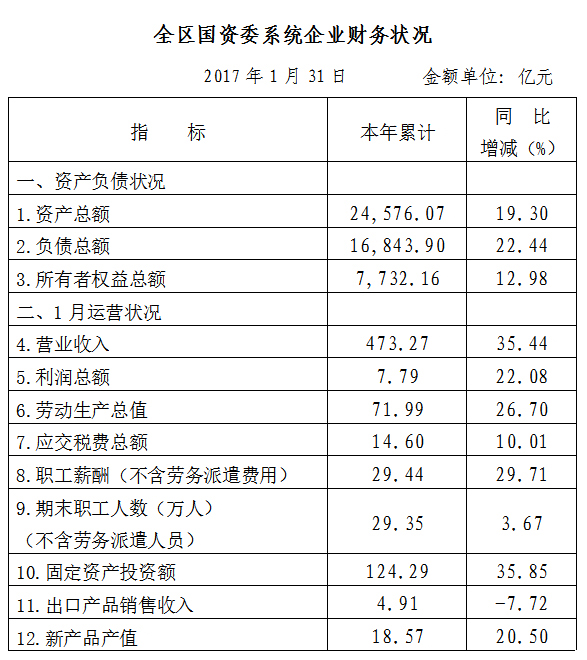 2017年(nian)1月(yue)份,廣西(xi)國資委(wei)系(xi)統企業經濟運(yun)行簡(jian)況(kuang)如(ru)下: