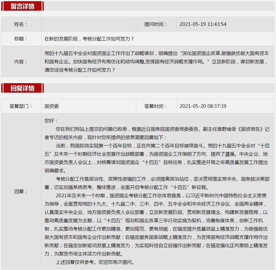 2021年5月國資委網站政務咨詢欄目部分網友提出的咨詢,我們初步做出了認真的回應,現選擇五條關注度高、點擊量高的問題,再次推薦分享。