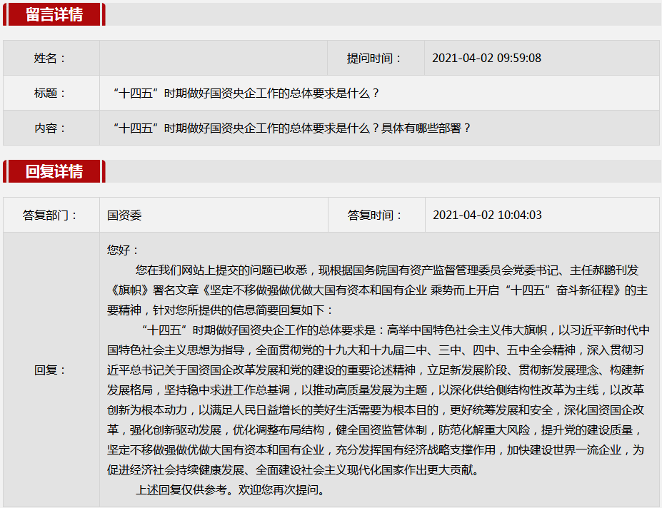 2021年4月國資委網站政務咨詢欄目部分網友提出的咨詢,我們初步做出了認真的回應,現選擇五條關注度高、點擊量高的問題,再次推薦分享。