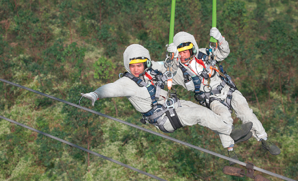 廣東省輸變電工程有限公司開展國內首次直升機帶導線X光檢測作業時,帶點作業員靠近電廠瞬間。(楊惠平 攝)