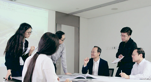 2018年,中國建(jian)研院青年專家們在投(tou)影屏幕前,探討圖紙,規劃建(jian)筑設計(ji)具體方案(an)。