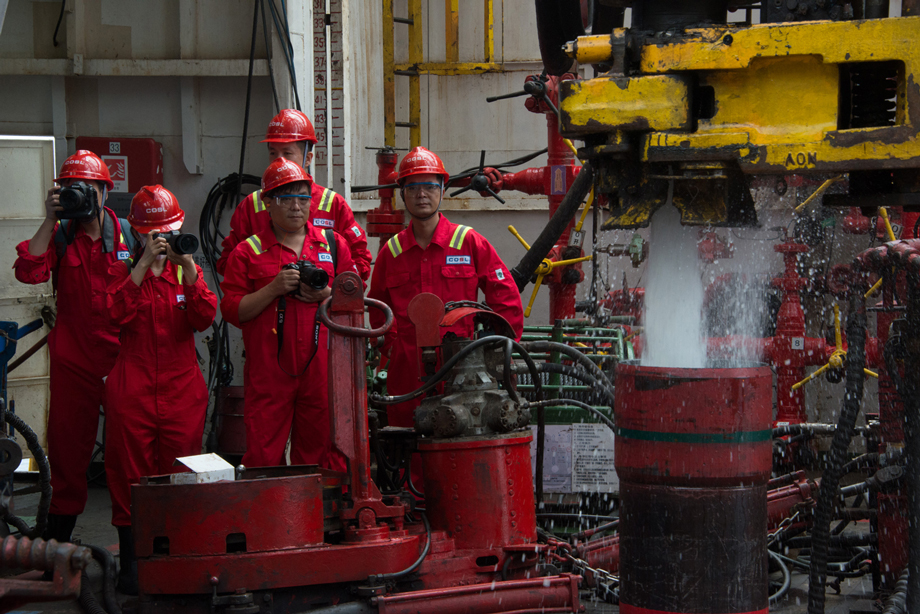 在位于(yu)平臺(tai)中部的井(jing)架塔下(xia),攝(she)影(ying)師們記(ji)錄下(xia)“南(nan)海二號”鉆(zhan)井(jing)作業的生(sheng)產場(chang)景。(初魯(lu)京 攝(she))