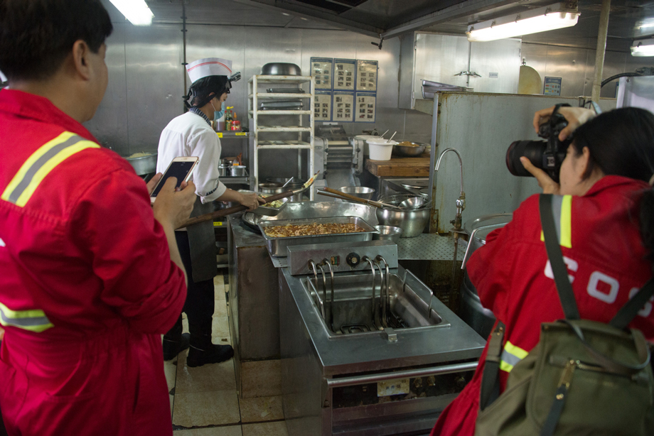 攝影(ying)師們(men)深入“南海(hai)二號”平臺廚房,拍攝海(hai)上大廚的工作場景(jing)。(張馨亞 攝)