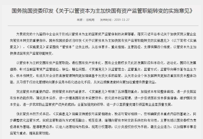2019年(nian)11月(yue)(yue)7日,為(wei)貫(guan)徹落(luo)(luo)實黨的(de)(de)(de)十(shi)九屆四中(zhong)全會(hui)關(guan)于形成以(yi)管(guan)(guan)資(zi)(zi)本(ben)為(wei)主(zhu)的(de)(de)(de)國(guo)有(you)資(zi)(zi)產監(jian)管(guan)(guan)體制(zhi)的(de)(de)(de)決策部署,按照(zhao)黨中(zhong)央、國(guo)務院關(guan)于深化國(guo)資(zi)(zi)國(guo)企改革的(de)(de)(de)有(you)關(guan)要求(qiu),國(guo)資(zi)(zi)委(wei)印發《關(guan)于以(yi)管(guan)(guan)資(zi)(zi)本(ben)為(wei)主(zhu)加快國(guo)有(you)資(zi)(zi)產監(jian)管(guan)(guan)職(zhi)(zhi)能轉(zhuan)(zhuan)變的(de)(de)(de)實施意(yi)見(jian)》(簡稱(cheng)《實施意(yi)見(jian)》)。11月(yue)(yue)27日,國(guo)務院國(guo)資(zi)(zi)委(wei)在(zai)京召開政策吹風會(hui)時表示,《實施意(yi)見(jian)》是國(guo)資(zi)(zi)監(jian)管(guan)(guan)機(ji)構第一次(ci)以(yi)文件的(de)(de)(de)形式,明(ming)確(que)管(guan)(guan)資(zi)(zi)本(ben)的(de)(de)(de)具體路徑(jing)。國(guo)資(zi)(zi)委(wei)將以(yi)此(ci)次(ci)職(zhi)(zhi)能轉(zhuan)(zhuan)變為(wei)新起(qi)點(dian)(dian),按照(zhao)《實施意(yi)見(jian)》明(ming)確(que)的(de)(de)(de)方向和路徑(jing),全面落(luo)(luo)實各項措施,著(zhu)力完善以(yi)管(guan)(guan)資(zi)(zi)本(ben)為(wei)主(zhu)的(de)(de)(de)國(guo)有(you)資(zi)(zi)產監(jian)管(guan)(guan)體制(zhi),不斷(duan)提高監(jian)管(guan)(guan)的(de)(de)(de)系(xi)統性(xing)針對性(xing)有(you)效性(xing),確(que)保管(guan)(guan)資(zi)(zi)本(ben)重點(dian)(dian)任務落(luo)(luo)實落(luo)(luo)地。