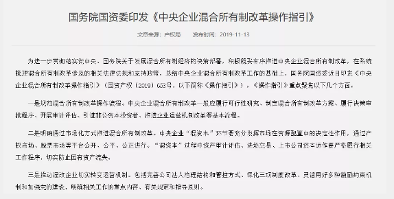國務院國資委制定《中央企業混合所有制改革操作指引》