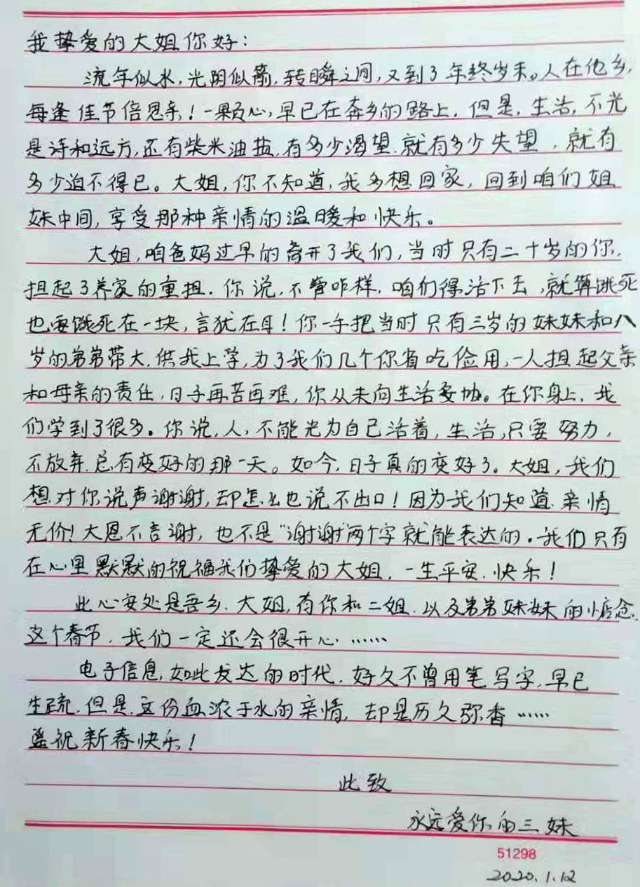 大姐,咱爸媽過早地離開了我們,當時只有二十歲的你,擔起了養家的重擔,你說,不管咋樣,咱們得活下去,就算餓死,也要餓死到一塊,言猶在耳!你一手把當時只有三歲的妹妹和八歲的弟弟帶大,供我上學,為了我們幾個你省吃儉用,一人擔起父親和母親的責任。日子再苦再難,你從未向生活妥協。在你身上,我們學到了很多。你說,人,不能光為自己活著,生活,只要努力,不放棄,總有變好的那一天。如今,日子真的變好了,大姐,我們想對你說聲謝謝,當面卻怎么也說不出口!因為我們知道,親情無價!大恩不言謝,也不是謝謝兩個字就能表達的,我們只有在心里 ,默默地祝福我們摯愛的大姐,一生平安,快樂!