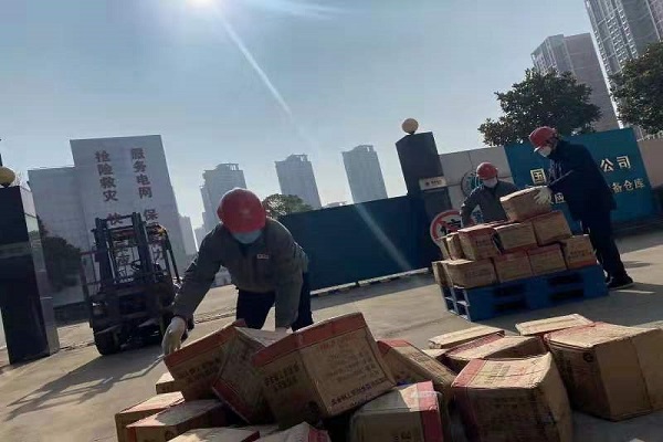 1月31日,國網湖北電力統一采購的口罩、防護服等后勤防疫物資運達武漢丹水池應急中心庫,國網湖北物資公司員工進行裝卸搬運入庫。