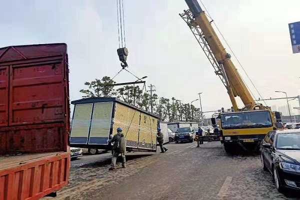 1月28日,武漢雷神山醫院建設配套供電工程應急物資運達施工現場,國網武漢供電公司物資部組織現場人員正在吊裝630千伏安箱式變電站。