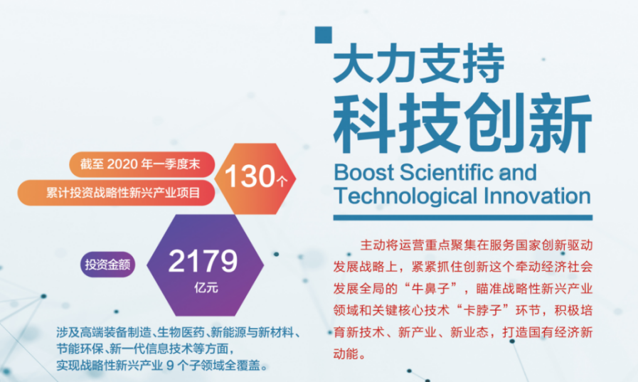 截(jie)至2020年4月(yue)底,累計投資(zi)戰(zhan)(zhan)略(lve)性新(xin)興(xing)產業(ye)項目(mu)超過130個、金額超過2200億(yi)(yi)元(yuan),涉(she)及高端裝備制造、生(sheng)物醫藥、新(xin)能(neng)源與新(xin)材料、節能(neng)環保、新(xin)一代信息技術等方面,實現戰(zhan)(zhan)略(lve)性新(xin)興(xing)產業(ye)9個子領域全覆蓋(gai)。經初(chu)步(bu)統(tong)計,所投項目(mu)已在科創(chuang)板上市交(jiao)易(yi)(yi)5家(jia),已通過審查待交(jiao)易(yi)(yi)3家(jia),另(ling)有5家(jia)正在審批(pi)或申報中。同(tong)時(shi),創(chuang)立(li)(li)央企創(chuang)新(xin)驅(qu)動(dong)指數并發行相關ETF產品,募(mu)集總(zong)規模超過400億(yi)(yi)元(yuan),在資(zi)本市場樹立(li)(li)創(chuang)新(xin)風向標(biao)。