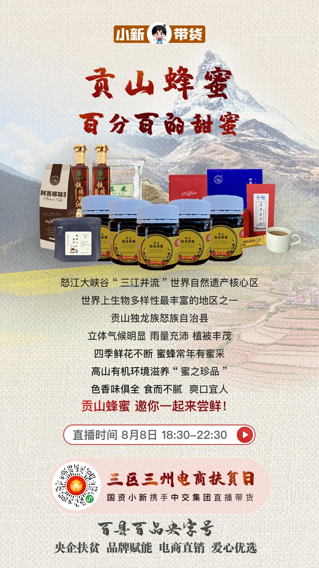 黨(dang)的(de)十八大以來,中(zhong)交(jiao)(jiao)集(ji)團向(xiang)定點幫扶(fu)的(de)云南怒(nu)江傈僳族自(zi)治州累計(ji)投入幫扶(fu)資金5.6億余元,與怒(nu)江州共同組建中(zhong)交(jiao)(jiao)怒(nu)江產業扶(fu)貧(pin)開發(fa)有限公司,助力怒(nu)江州累計(ji)脫貧(pin)26.78萬人(ren),貧(pin)困發(fa)生率(lv)從(cong)56.24%下降到零,其中(zhong)貢山縣(xian)于(yu)2019年正(zheng)式摘帽。中(zhong)交(jiao)(jiao)集(ji)團在直播間帶貨的(de)貢山蜂蜜(mi)(mi)就(jiu)是(shi)產業扶(fu)貧(pin)的(de)結晶,產自(zi)怒(nu)江州貢山獨龍(long)族怒(nu)族自(zi)治縣(xian),是(shi)由(you)東方蜜(mi)(mi)蜂喜(xi)馬拉(la)雅亞種(zhong)(zhong)采集(ji)怒(nu)江大峽谷(gu)高寒深林多(duo)種(zhong)(zhong)蜜(mi)(mi)源植物的(de)珍貴蜂蜜(mi)(mi)。