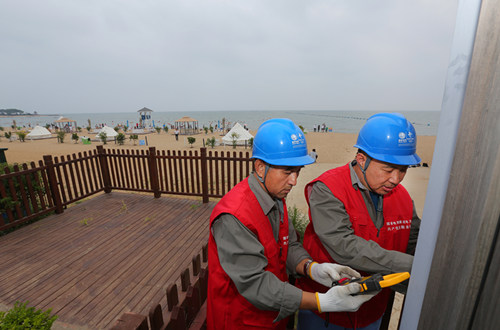 國網秦皇島供電公司共產黨員服務隊對北戴河海邊浴場箱式變壓器進行巡視檢查。