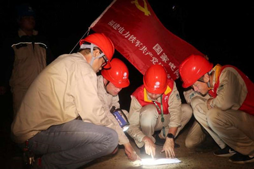 國網福建漳州供電公司共產黨員服務隊連夜搶修漳浦赤湖鎮10千伏將軍沃線,抗擊臺風“米克拉”。