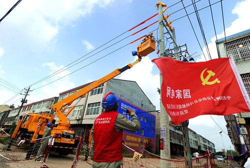 國家電網陜西張思德(延安棗園)共產黨員服務隊在廟溝村進行線路搶修。