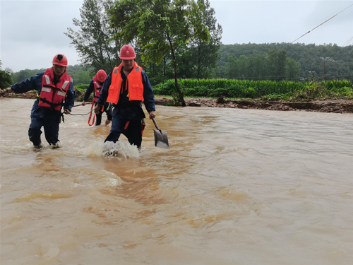 國網河南遂平縣供電公司員工淌水到嵖岈山鎮紅石崖村修復受損低壓供電線路。