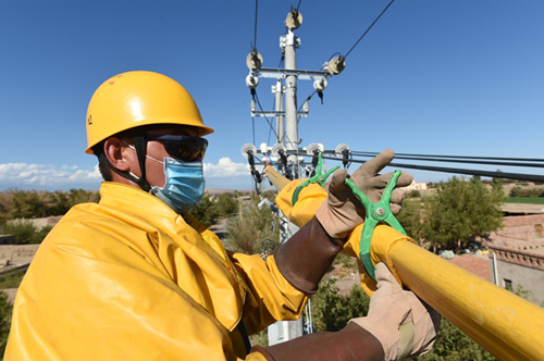 國網新疆吐魯番供電公司員工在42℃高溫下開展帶電作業。