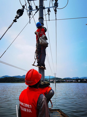國網江西彭澤縣供電公司黨員服務隊乘船檢修被淹的10千伏農場線。