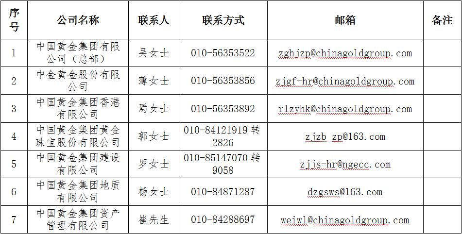 招聘(pin)單位及(ji)(ji)崗位信息(xi),請詳見附件《中國黃(huang)金集團有限公(gong)司總部及(ji)(ji)在京單位2021年度高校畢業生公(gong)開(kai)招聘(pin)崗位信息(xi)表》。