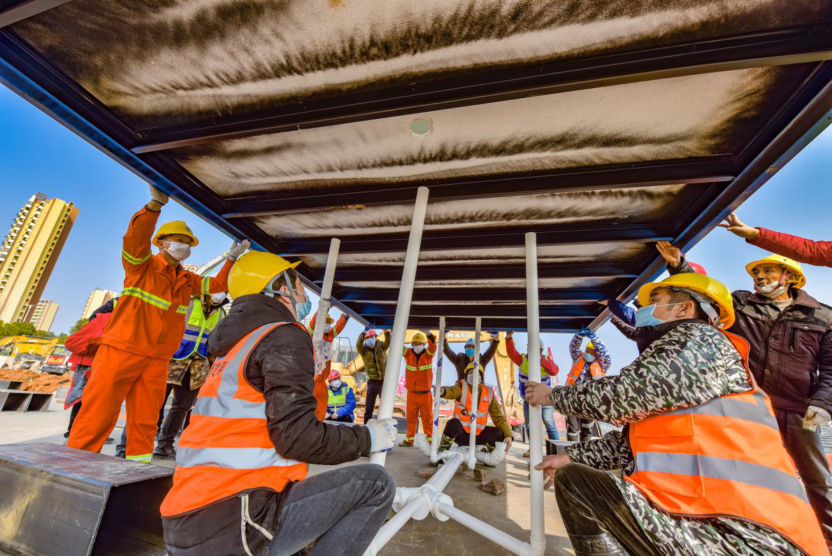 “兩山”醫(yi)院(yuan)按(an)照傳染病醫(yi)院(yuan)進(jin)行(xing)設(she)(she)(she)計,環保(bao)要求高。功(gong)(gong)能(neng)區繁多且劃分嚴格,為(wei)避(bi)免交(jiao)叉感染需單獨設(she)(she)(she)置新風系統。建(jian)(jian)筑布局(ju)(ju)復雜,對既有箱式房改造量大。面對不(bu)利條件(jian),中建(jian)(jian)三局(ju)(ju)堅(jian)持以安全第(di)一(yi)、質(zhi)量至(zhi)上、功(gong)(gong)能(neng)達(da)標為(wei)前提,堅(jian)持高標準(zhun)施工。一(yi)是(shi)采用裝配式建(jian)(jian)筑,像搭積木一(yi)樣蓋房子,效率高、成(cheng)本低、污染少。二是(shi)地基施工鋪設(she)(she)(she)近20萬平方米HDPE防滲膜,防止污水和(he)廢(fei)水下滲。集中收集、處理污水和(he)廢(fei)水,經檢測合(he)格再予以排(pai)放(fang)。生(sheng)活垃(la)圾和(he)醫(yi)療(liao)廢(fei)棄(qi)物(wu)均配備收集設(she)(she)(she)施。三是(shi)積極配合(he)完成(cheng)病房內的(de)供氧系統、監測系統等(deng)醫(yi)療(liao)設(she)(she)(she)備和(he)系統的(de)安裝,確保(bao)交(jiao)付(fu)即(ji)可使用。