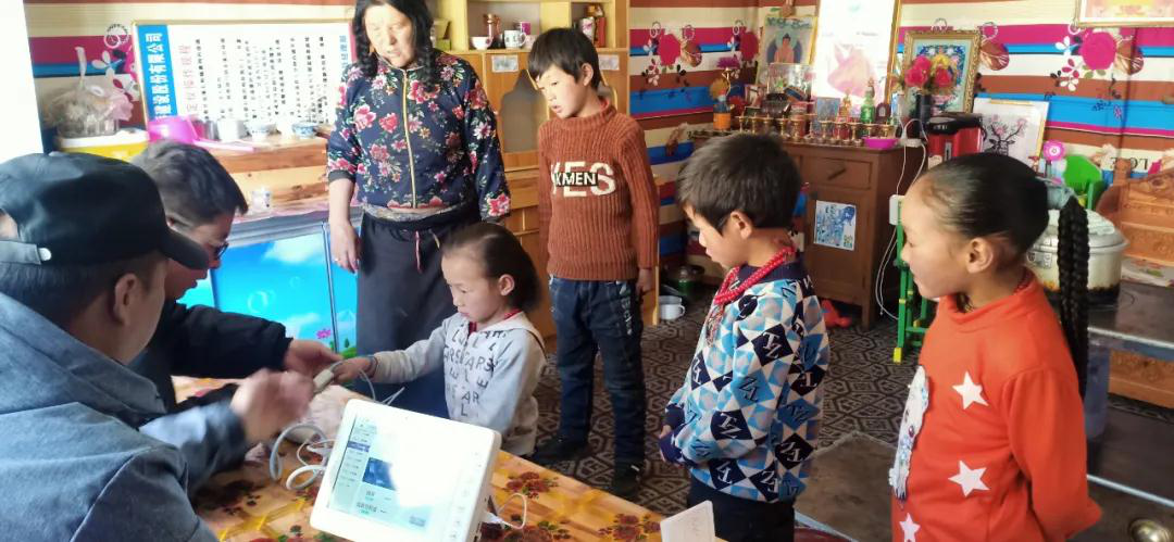 從2018年開始,中國普天在達日搭建了覆蓋9鄉1鎮的“互聯網+健康扶貧”體系,針對貧困戶開展健康檔案立檔建卡工作。圖為鄉鎮衛生院使用普天援助的健康檢測一體機開展入戶篩查。