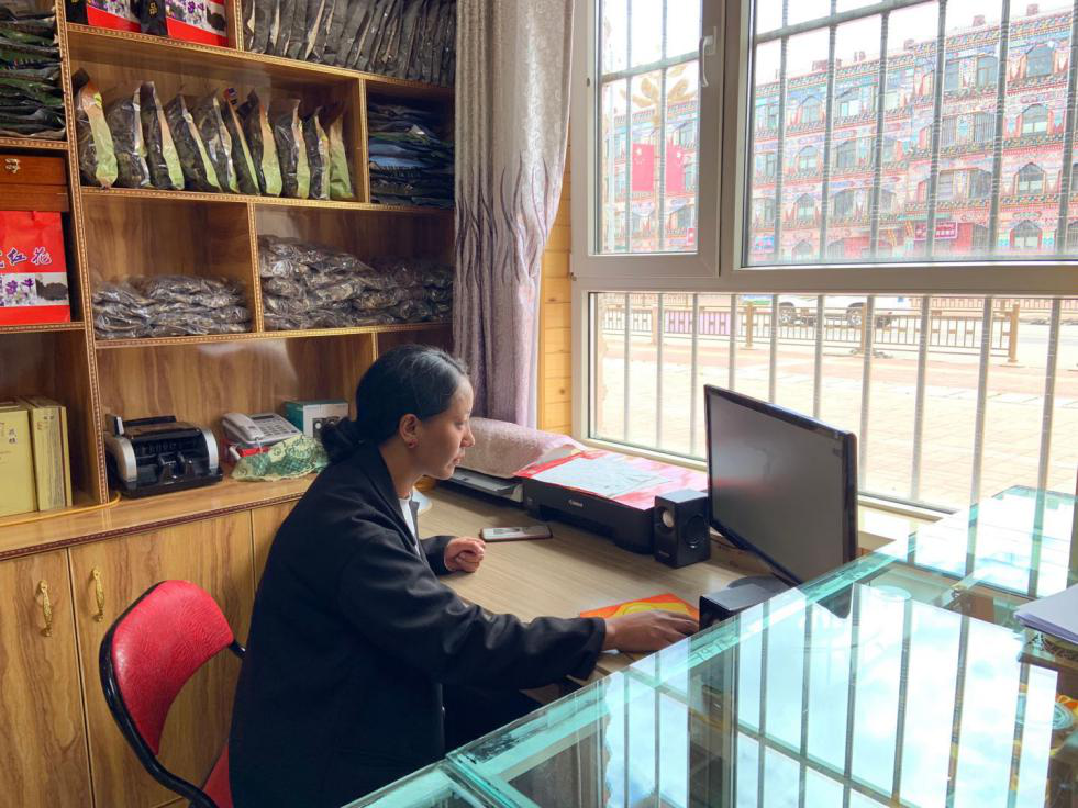 中國普天積極對當地牧民開展技能培訓,打通渠道授人以漁。圖為,青普六部落產業有限公司的依毛措利用央企消費扶貧電商平臺進行牧區特產的銷售。