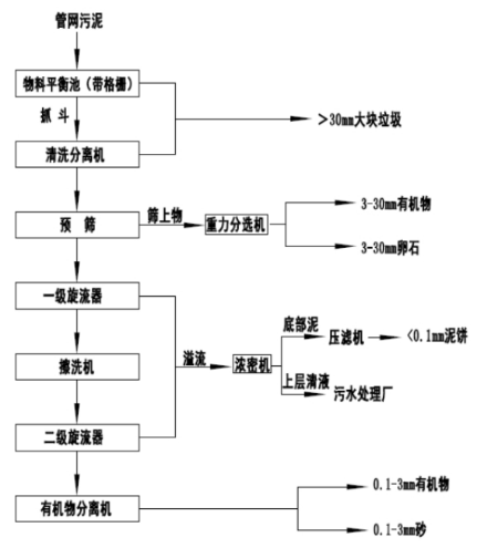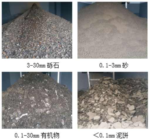 2、處理后產物,處理后產物包括垃圾、礫石、砂、有機物、泥:1.粒徑>30mm垃圾;2.粒徑3-30mm礫石;3.粒徑0.1-3mm砂;4.粒徑0.1-30mm有機物;5.粒徑<0.1mm的泥餅