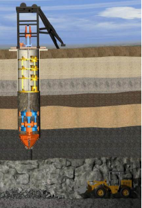 【技術產品簡介】導井式豎井掘進機是國內首臺套具有自主知識產權,利用反井鉆孔作為導井的大型綜合鑿井裝備。創新形成了“整體框架導向、多點支撐、變頻電機驅動、行星加單級減速、四油缸推進、錐形鉆頭破巖和超前鉆頭糾偏”的豎井掘進機整體結構,通過光纜或網絡能夠實現遠程控制,減少井下作業人員。其涉及巖石破碎、機械加工、電氣傳動、液壓控制、傳感器測量、數字控制等多學科,用機械破巖代替傳統的鉆眼爆破破巖,能夠實現破巖、出渣、支護平行作業,鉆鑿直徑5.8-6.0m、深度800m-1000m的豎井井筒,具有機械化程度高、不需爆破作業、井下人員少、施工效率高、成井質量好、安全性高等優點。